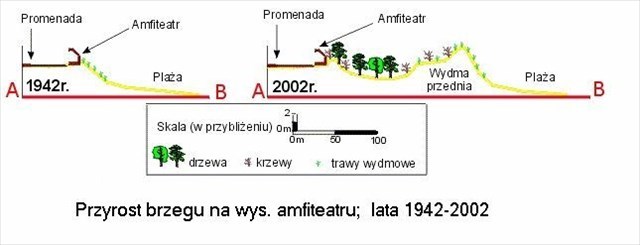 Procesy tworzenia się wydm trwają do dnia dzisiejszego i są procesami bardzo dynamicznymi; w ciągu kilkudziesięciu lat potrafią znacznie zmienić topografię terenu. Można to zobrazować na przykładzie miejsca w pobliżu amfiteatru, w terenie podanych w listingu współrzędnych. W roku 1942 promenada (usytuowana w tym samym miejscu, co w chwili obecnej) wraz z ciągnącymi się wzdłuż niej licznymi domami wczasowymi, willami i hotelami była w bezpośredniej bliskości plaży. Pomiędzy plażą a promenadą istniała tylko niska wydma pierwotna utrzymywana za pomocą nasadzeń roślinności pierwotnej. Amfiteatr znajdował się na brzegu wydmy niskiej, bezpośrednio przy plaży, w odległości 100-130 metrów od brzegu morza - pokazują to poniższe obrazki.