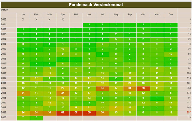 Um herauszufinden, ob du die Challenge bereits erfüllst oder welche Monate dir noch fehlen, verwende das Tool wie z. B. auf https://project-gc.com/Statistics/ProfileStats "Funde nach Versteckdatum" (siehe mein Ergebnis unten).