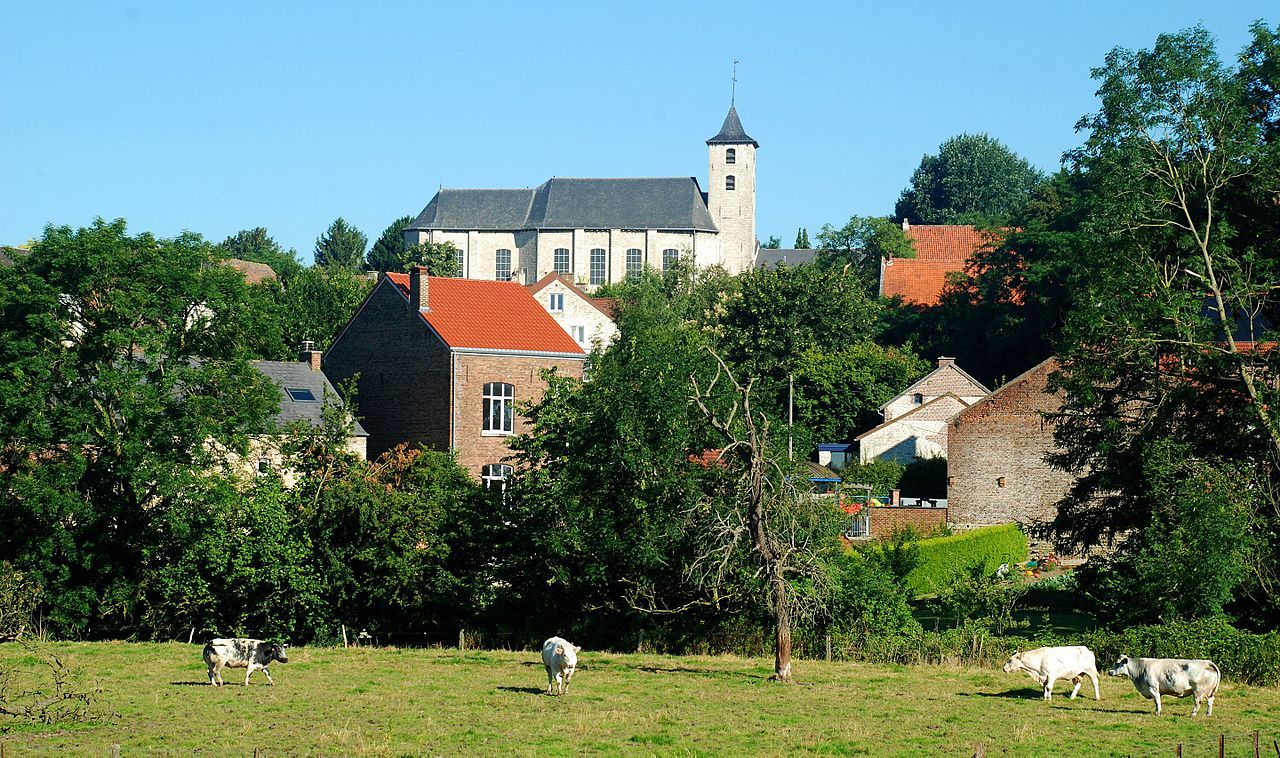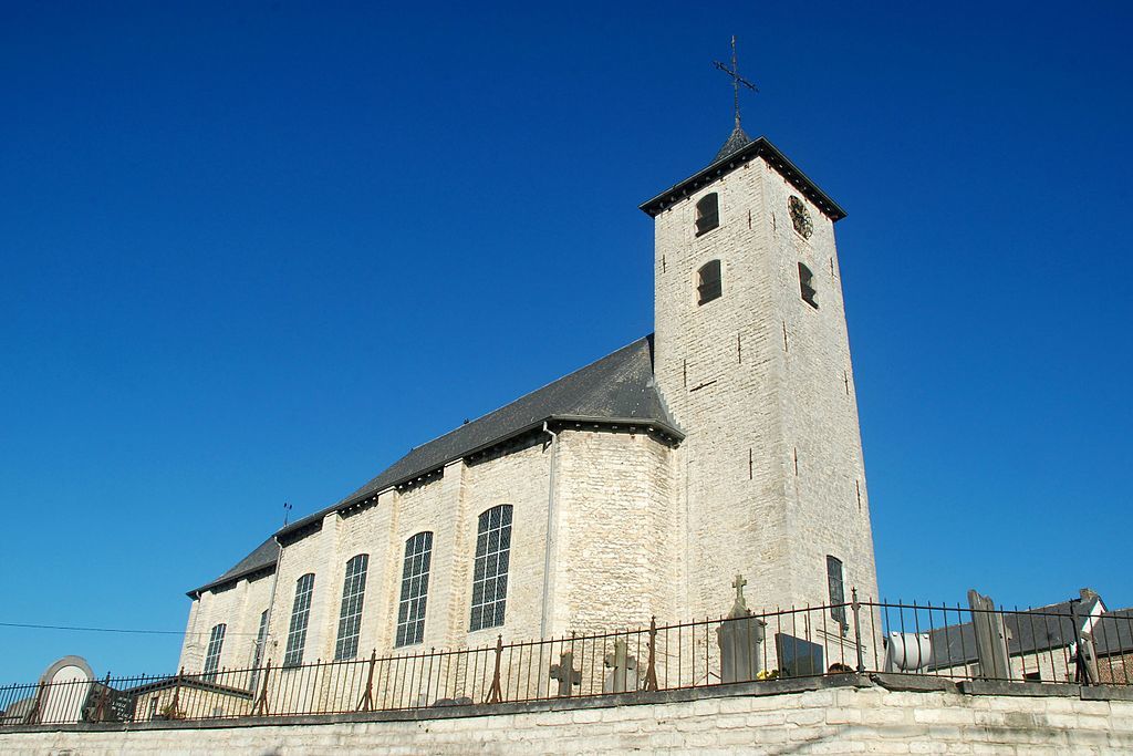 L'église, entourée de son cimetière, se dresse en hauteur, au sommet du village, à l'intersection de la rue de la Cense Bivort et du chemin des Carriers. Occupant le point culminant, sa silhouette domine le village et le paysage et se voit de loin.