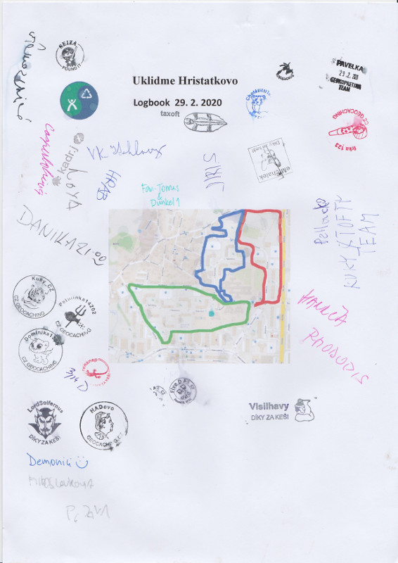 Rozdam pytle a rozdelime se na 2 skupiny, cervenou a modrou. Kazda skupina projde svoji oblast a potkame se v ulici Bendova. Vyhodnotime plnost pytlu, plne odlozime na domluvene misto pred uradem, rozdame nove a projdeme zelenou oblast - jedna skupina levou cast od ulici Spanielova a druha pravou.