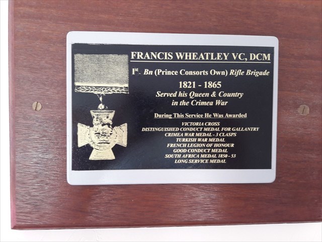 The citation for his VC reads: On 12 October 1854 Wheatley and some other Riflemen were occupying a section of the trenches before Sevastopol when a live Russian shell fell amongst the men. Without hesitation Wheatley seized hold of the shell and endeavoured to knock the fuse out with the butt of his rifle. He was unsuccessful at the first attempt and so, with great presence of mind and deliberation he managed somehow to heave it over the parapet of the trench. It had scarcely fallen outside when it exploded. Had it not been for his coolness, presence of mind and supreme courage and discipline, the shell would have inevitably exploded amongst the party causing serious casualties, but instead not a man was hurt.