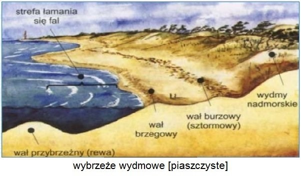 W Polsce obserwuje się głównie wybrzeża: klifowe i wydmowe [piaszczyste] oraz w niedużym stopniu deltowe i mierzejowe. Szczególną cechą linii brzegowej południowego Bałtyku są piaszczyste, szerokie, białe i czyste plaże. Tylko niespełna 30% plaż na świecie to plaże piaszczyste.