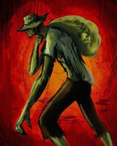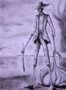 According to the legend, the spirit is a youth who murdered and disembowelled his father for killing his wife, saying that she was a “slut”, and that she was asking for it. Afterwards, his grandfather ordered the youth to be tied to a post in the middle of the countryside, and lashed him until his back was destroyed. His wounds were then cleaned with alcohol and he was released with two rabid, starving dogs set upon him. Before releasing him, his grandfather condemned him to carry the bones of his father for all eternity.
