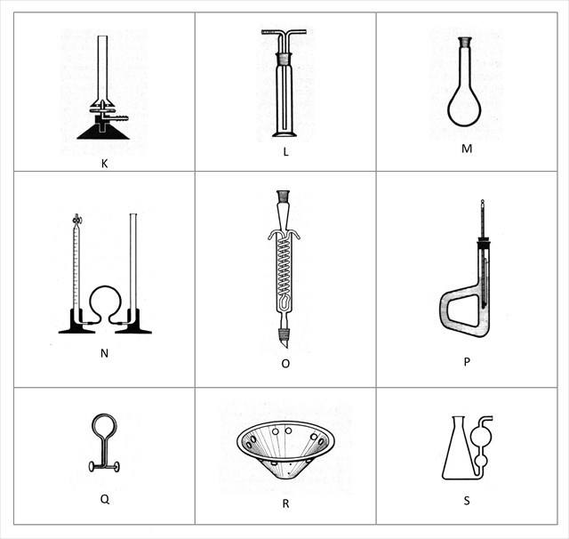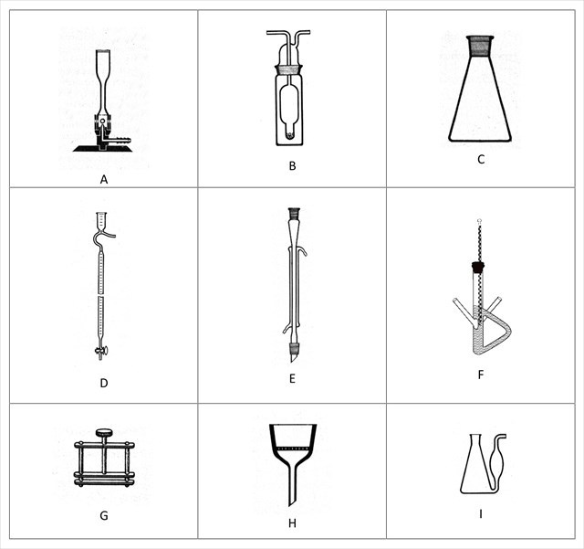 Laborgasbrenner, Acetylenbürette, Gasbürette, Schmelzpunktbestimmungsapparat, Laborkühler, Langhalsrundkolben, Quetschhahn, Gaswaschflasche, Absorptionsvorlage, Luftbäder