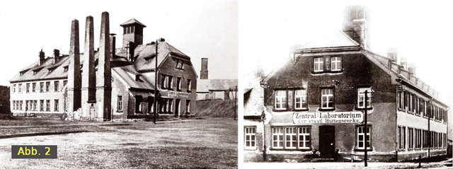 Bei dieser Frage kam mir die Idee für diesen Mystery. Es fehlte nur noch die entsprechende Örtlichkeit. Schließlich erinnerte ich mich an ein Foto, das ich in unserem Ortsarchiv schon mal gesehen hatte. Von 1910 bis 1994 existierte in Muldenhütten ein Zentrallabor für die umliegenden Hüttenbetriebe. Leider wurde das Gebäude 1994 abgerissen (Abb. 2). So bleibt nur noch ein schöner Blick auf das Hüttengelände, den Ihr vom Cache aus genießen könnt.