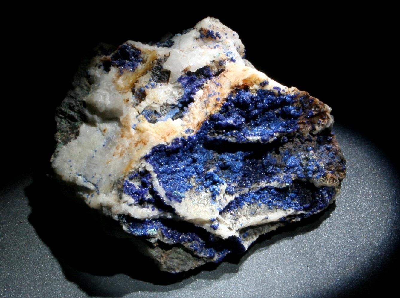 Eher seltener sind Funde des tiefblauen Kupferminerals Azurit (,,Kupferlasur"):