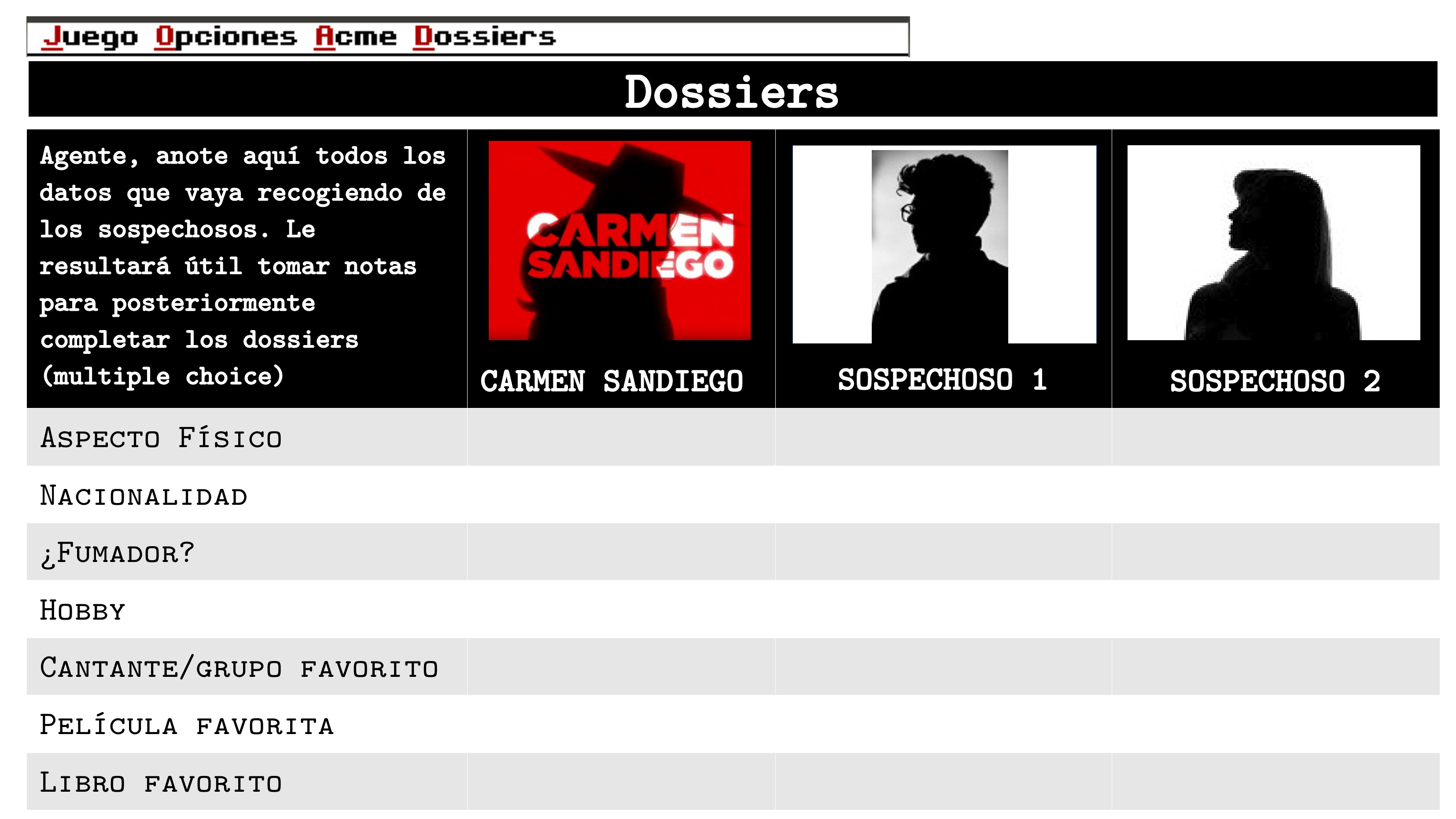 Tu tarea como agente de una prestigiosa agencia de espionaje europea es identificar a los miembros de su banda y atraparla antes de que den su gran golpe. Esto requerirá viajar por toda Europa, para elaborar un concienzudo perfil de los tres sospechosos. Como sabrás, nuestros prestigioso sistema de Inteligencia Artificial es capaz de localizar a cualquier criminal del que dispongamos los datos que aparecen en el dossier. Aqui puedes descargar una copia en papel del mismo que tendras que completar: DOSSIER.