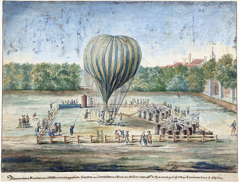 Rijksmuseum Amsterdam. The ascent of the gas-balloon by Frenchman Jean-Pierre Blanchard in the Palace garden at Noordeinde Palace in The Hague (the Netherlands), on July 12, 1785. The balloon landed in the village Zevenhuizen. The balloon is being inflated within a demarcation around which a crowd gathered. Ascension of the first manned balloon in the Netherlands.