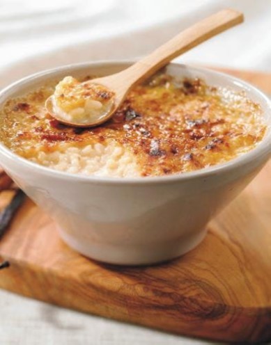 1– Commencez la préparation en mettant le riz dans une grande terrine en terre cuite. Ajoutez le sucre en poudre, le sel et la cannelle et mélangez le tout avec une spatule.