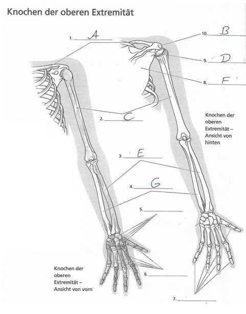 Auf dem Bild seht ihr die Knochen der OEX (oberen Extremität) und ein paar Buchstaben, die Euch bei der Berechnung der Koordinaten helfen können. Jeder Buchstabe steht für eine Ziffer