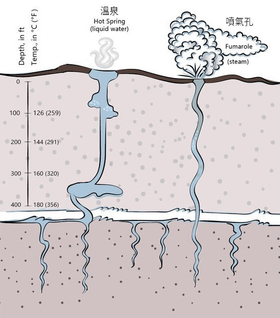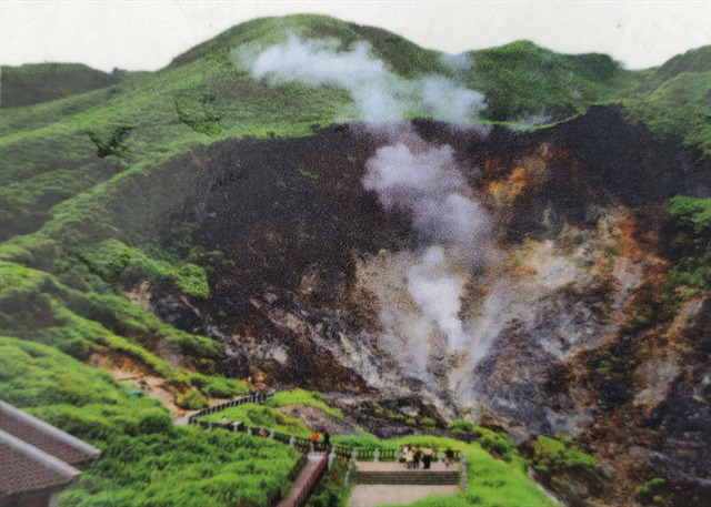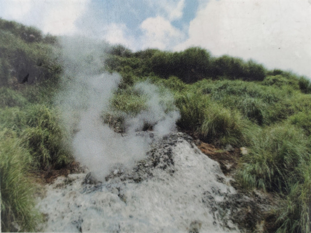 Xiaoyoukeng is a post-volcanic fumarole located in Yangmingshan National Park in the north of Taiwan. It is located at the northwestern foot of Qixing Mountain and is about 805 meters above sea level. Xiaoyoukeng is on of the most geologically active scenic areas in Yangmingshan-Nationalpark. Fumaroles are volcanic steam outlets near volcanic active areas. A fumarole is an opening in earth’s crust, often in the neighbourhood of volcanoes, which emits steam and gases such as carbon dioxide, sulphur dioxide, hydrochloric acid, and hydrogen sulphide. Mostly water vapor and partly volcanic gases are emitted. Due to the lack of pressure, water is completely converted into steam before it flows out. When more water is available and rises to the surface at a spot where the soil is rich in volcanic ash, clay, and other fine particulates, then mudpots or hotsprings are formed. You can see a mudpot on your way to the platform. Fumaroles and hotsprings may occur along tiny cracks, along long fissure, or in chaotic clusters or fields. A fumarole field is an area of thermal springs and gas vents where shallow magma or hot igneous rocks release gases or interact with groundwater.