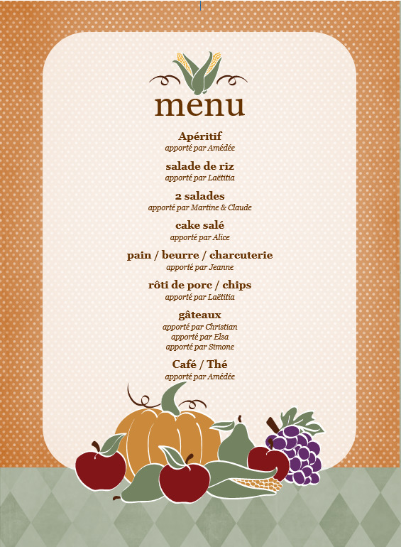 Vous trouverez ci-dessous la liste des plats apportés par chacun.