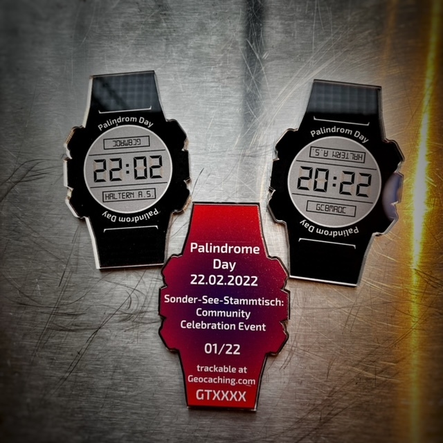 Ich habe die Absicht, zu diesem "Palindrom-Day" einen eigenen trackbaren Token in einer limitierten Auflage von 22 (natürlich!) Exemplaren produzieren zu lassen (s. nachfolgendes Bild). Dieser Token besteht aus Kunststoff, ist ca. 7 cm hoch und 4 cm breit; durch Drehen des Tokens wird aus der "22.02." eine "20.22". Der Preis liegt bei 5 Euronen pro Stück.