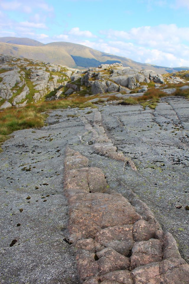 Aplite, is an intrusive igneous rock, with a similar composition to granite, but with much finer crystals, under 1 mm in diameter. The dominant materials are quartz and feldspar. The term 'aplite' or 'aplitic' is often used as a textural term to descrie veins of quartz and feldspar with a fine to medium-grain "sugary" texture. Aplites are usually very fine-grained, white, grey or pinkish, and their constituents are visible only with the help of a magnifying lens. The aplites of granite areas, are the last part of the magma to crystallize, which has happened rapidly, with the ingredients solidifying almost at the same time. Aplites can also be first formed as they can be the end of the 'fingers' from the magma body in to the bedrock. If you take your time to look around the steps, you will notice a distinct line in the granite, this is an aplites.