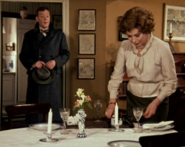 I kender sikkert tv serien Matador, og det er nok svært at finde en film, der omhandler hverdagsbilledet mere end Matador, hvor man udover selve handlingen gjorde meget ud af, at omgivelserne som vi ser i filmen skulle være autentiske ned i mindste detalje. En af detaljerne er det spisestel med tilhørende vase, og lysestager som Elisabeth dækker op med her.