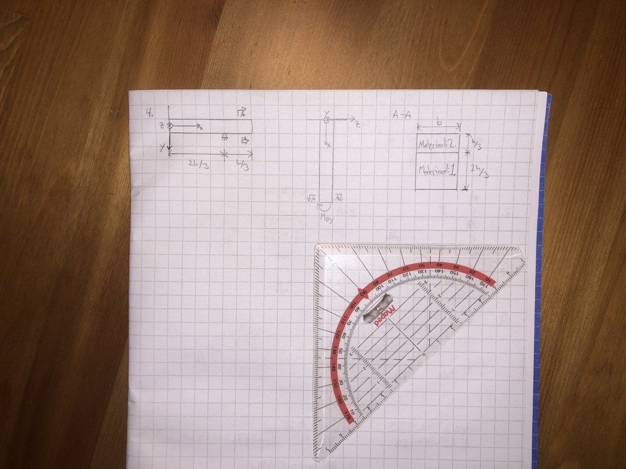 4. Rakenteesta tarkoituksesi on määrittää rasitetuimman poikkileukkauksen iteseisarvoltaan suurimman vetojännityksen sijainnin y ja z koordinaatit millimetreissä. Tason origo on vetojäykkyyskeskiössä. Ynnäämällä nämä saat arvon D. Palkin pituus [L] on 9 m, korkeus [h] on 0,6 m ja leveys 0,2 m. Materiaalin 2 kimmokerroin on neljä kertaa isompi kuin materiaalilla 1. Käytä Bernoullin palkkimallia ja huomioi omapaino, maa on suunnassa y.