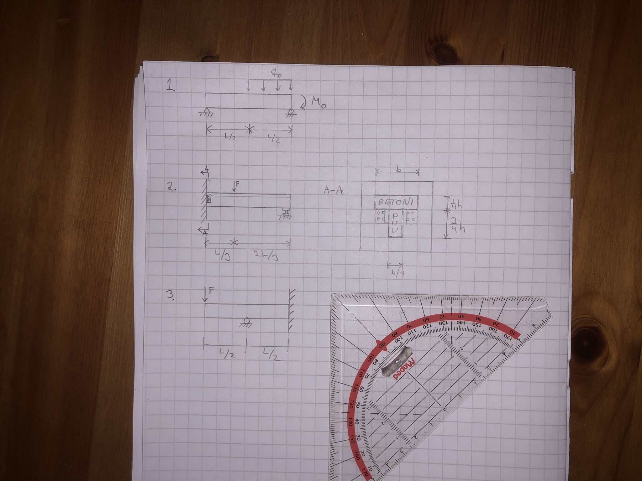 2. Rakenteesta tarkoituksesi on määrittää rasitetuimman poikkileikkauksen normaalijännityksistä itseisarvoltaan suurimmat puristuksen ja vedon arvon yksikössä MPa. Näiden kertoma olkoon B. Tarvitset ratkaisuun seuraavia tietoja: palkin pituus [L] on 4 m, poikkileikkauksen leveys ja korkeus [h] ovat 0,4 m, käytä betonille kimmokerrointa 36 GPa ja puulle 16 GPa ja voiman [F] arvo on 30 kN. Käytä Timoschenkon palkkimallia, äläkä huomioi omapainoa.
