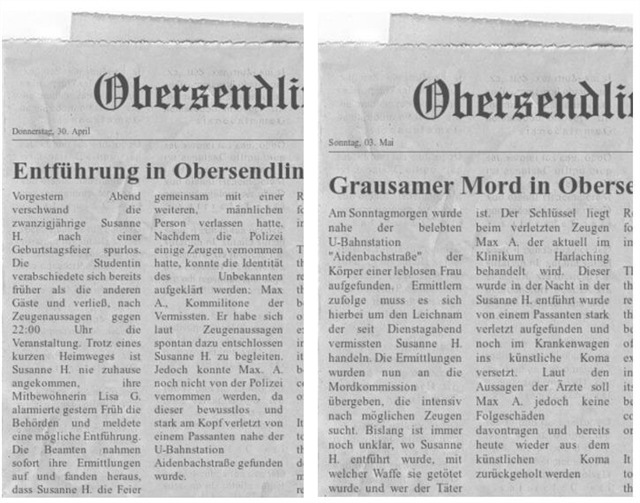 Max A.: Ich reichte ihr die Hand…Dann ging alles ganz schnell…ein dumpfes Geräusch…Ich spürte ein Stechen im Kopf……Susi fing an zu schreien…ich lag auf dem Boden..Susi neben mir, sie war verletzt... ich wurde gefesselt und gepackt...in ein Auto getragen...eine Rückbank…meine Hände..ich konnte sie nicht spüren... Dann hörte ich wie der Täter zu Susi geht... Ein lautes Geräusch, das Auto wackelte kurz...Das musste der Kofferraum sein. Er muss sie in den Kofferraum gelegt haben