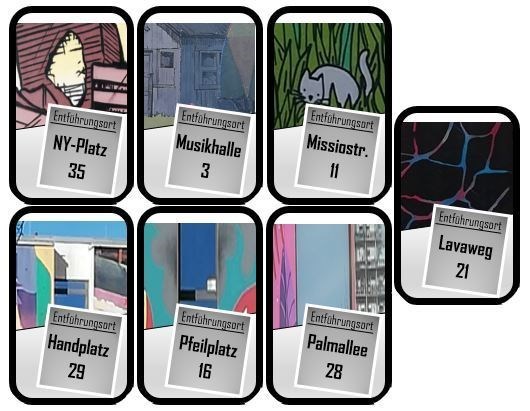 - Jede Koordinate ist explizit einer Wand zugeordnet. Manchmal wird eine Hauswand durch eine Fensterreihe in zwei Hälften "geteilt" (die jeweils mit einem eigenem Motiv versehen sind). Folge: Ein möglicher Entführungsort kann auch aus zwei Motiven bestehen (die Spielkarten helfen euch - schaut genau hin).
