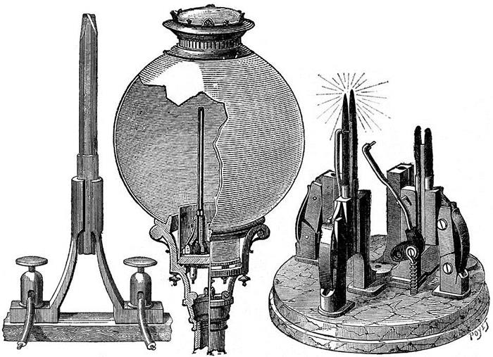První prakticky použitelný elektrický zdroj světla, tzv. Jabločkovu elekrickou svíčku, vynalezl ruský elektrotechnik Pavel Jabločkov, který na ni získal patent 23. března 1876 . Jeho oblouková lampa měla oproti dřívějším obloukovým lampám výhodu v tom, že ji nebylo potřeba mechanicky regulovat a hořela sama zhruba hodinu. Oblouková lampa, v níž je světlo vyzařováno elektrickým obloukem hořícím mezi dvěma elektrodami, byla známa už od počátku 19. století. Uhlíky v lampě původně směřovaly proti sobě a jak postupně odhořívaly, bylo nutné je stále posouvat. Jabločkov postavil uhlíky rovnoběžně vedle sebe a oddělil je vrstvou kaolinu. Pro svou jednoduchost se rázem začala vyrábět po tisících. Během několika let elektrickou svíčku postupně vytlačily další zdokonalené obloukovky a posléze žárovky, které svítily již na další mezinárodní výstavě v Pařiži v roce 1881.