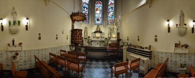 Neem zeker een kijkje in deze bidkapel wanneer de deur is geopend. Je ontdekt in het interieur: Witmarmeren altaar door N. Daems, met gepolychromeerd en gestoffeerd Onze-Lieve-Vrouwebeeld, geplaatst na de Tweede Wereldoorlog. Mooie neogotische houten preekstoel naar ontwerp van Taeymans, uitgevoerd door Moerman. Glas-in-loodramen met taferelen uit het leven van Maria, gedateerd 1898 in het koor.