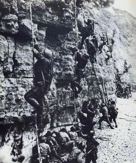 7h30 – Nous commençons l’ascension de la falaise, certains d’entre nous utilisent les échelles que l’on a prises aux pompiers anglais, moi j’utilise une corde que les allemands n’ont pas eu le temps de couper.