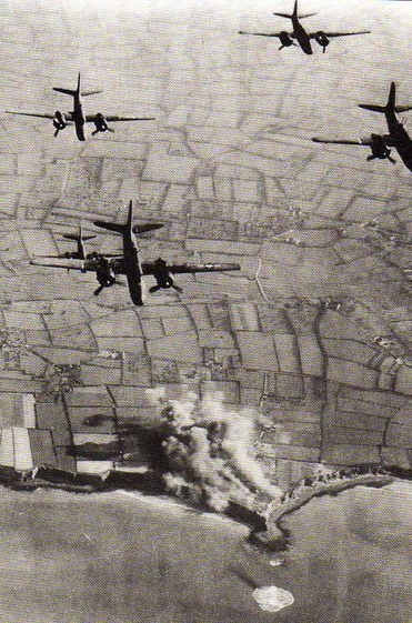 07.30 Uhr. — Wir fangen mit dem Aufstieg auf die Klippe an, einige von uns benutzen die Strickleitern, welche die englischen Feuerwehrmänner uns gegeben haben. Ich benutze ein Seil, das die Deutschen nicht schnell genug durchgeschnitten haben.