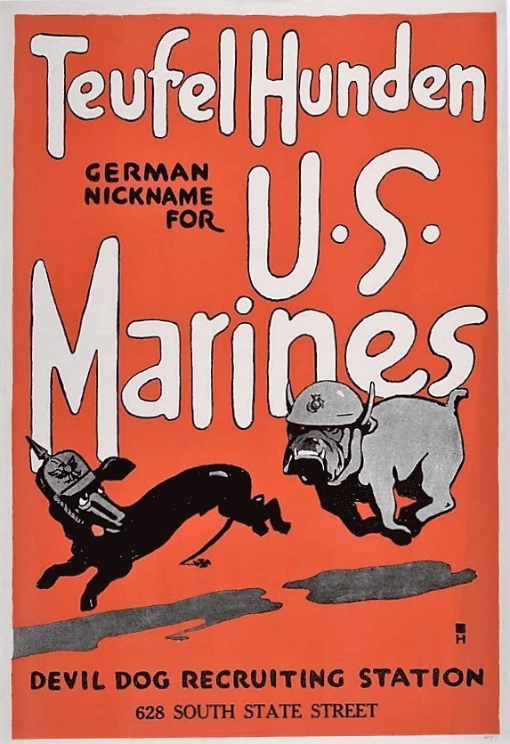 C’est ici que les Allemands les ont affublés de ce surnom, “devil dogs“ ( Teufel Hunden), en référence au chien qui vous mord et ne vous lâche pas. « Chien du Diable » dont le sens rejoint d’une certaine façon celui que véhicule leur devise officielle : « Semper Fidelis », « toujours fidèle ».