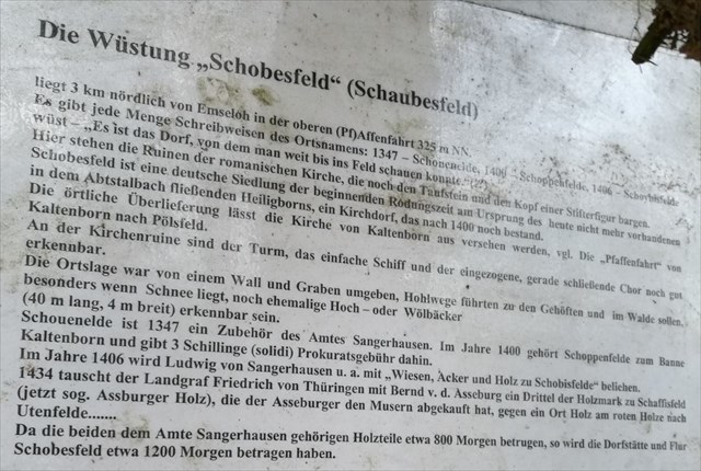 Viele Informationen über den ehemaligen Ort Schaubesfelde findet man weder im Internet noch vor Ort. Fest steht lediglich, dass die Siedlung noch um 1400 bestand und wohl nicht viel später verlassen wurde. Heute sieht man nur noch Reste der Dorfkirche (Reference Point).
