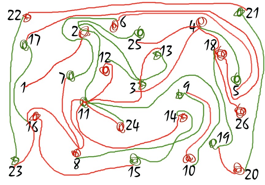 Er erinnert sich an ein altes Spiel, das die Kinder früher oft gespielt haben, als es noch keine Smartphones gab: Misthaufen fahren. Opa nimmt ein Blatt Papier und bittet Geoline, alle Zahlen darauf zu schreiben, die sie schon kennt. Geoline schreibt: 1, 2, 3, 4, 5 ... bis zur 26 kommt sie, dann ist das Blatt voll. "Sehr gut", sagt Opa und nimmt sich einen grünen Buntstift, Geoline gibt er einen roten. Er erklärt: "Jetzt müssen wir mit unseren Stiften von Zahl zu Zahl fahren. Immer abwechselnd. Du fängst an. Aber es gibt noch ein paar Regeln zu beachten! Neben jede Zahl malen wir einen "Misthaufen" Die bereits gezogenen Linien dürfen nicht gekreuzt werden, sonst bekommt man einen Strafpunkt. Nur die Misthaufen dürfen durchquert werden. Wer am Ende die wenigsten Strafpunkte hat, hat das Spiel gewonnen." Das ist einfach, das hat Geoline schnell verstanden. Und schon zieht sie den ersten Strich von der 1 bis zur 2. Dann ist Opa dran, dann wieder Geoline usw. Auf dem Blatt entsteht das blanke Chaos aus Strichen und Misthaufen und es wird immer schwieriger, zur nächsten Zahl zu gelangen. Nach ein paar Minuten ist die 26 erreicht. Doch was ist das?! Opa musste einmal einen Strich durchkreuzen, weil er keinen Weg durch einen Misthaufen gefunden hat. "Du hast einen Strafpunkt!", ruft Geoline, "ich hab gewonnen!" Das Spiel hat ihr offensichtlich Spaß gemacht. "Nochmal! Nochmal!", ruft sie - und hat nun gar keine Langeweile mehr.