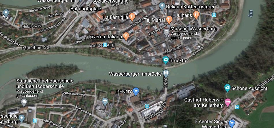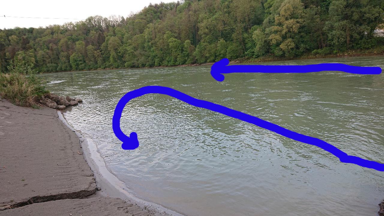 Der Earthcache liegt auf der Innenseite der Rechtskurve, die der Inn hier macht. Das meiste Wasser wird durch die Trägheit und durch die Fließgeschwindigkeit nach außen getragen, was man an der gegenüberliegenden Küste der "Innleitn" gut sehen kann. Hier frisst sich das Wasser in den Stein und in den Untergrund. An der Stelle des Earthcaches ist das Wasser relativ flach. Kombiniert mit der hohen Geschwindigkeit, die aus den letzten 200-300 m und der Rechtskurve resultiert, kommt eine große Menge Wasser mit hoher Geschwindigkeit an und begünstigt dadurch eine besonders starke Erosion.