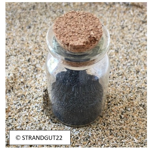 Die Farbe des Sandes ist dunkelgrau oder schwärzlich. Das im Sand vorherrschende Eisenmineral ist Magnetit Fe3O4, wobei der reine Eisenanteil je nach Fundort und Qualität zwischen 54 % und 60 % liegen kann. (Quelle: Wikipedia)