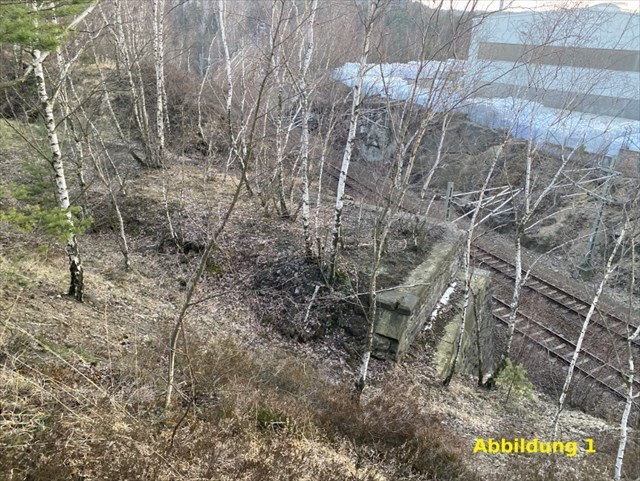 Nach wenigen Gehminuten passieren wir ein eingestürztes Zwischenlager der Dynamitproduktion, das sich auf der linken Seite des Weges befindet. Das Dach liegt etwa auf dem Niveau des Weges. Bitte wagt euch nicht zu weit vor und bleibt auf dem Weg. Das Dach war als Tonnengewölbe aus Beton ausgeführt und mit Erde abgedeckt. Die Einsturzursache konnte bisher nach Studium von Archivakten nicht geklärt werden. Lauft noch ein Stück weiter, bis ihr zur Aufnahmeposition der Abbildung 5 gelangt.