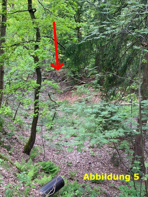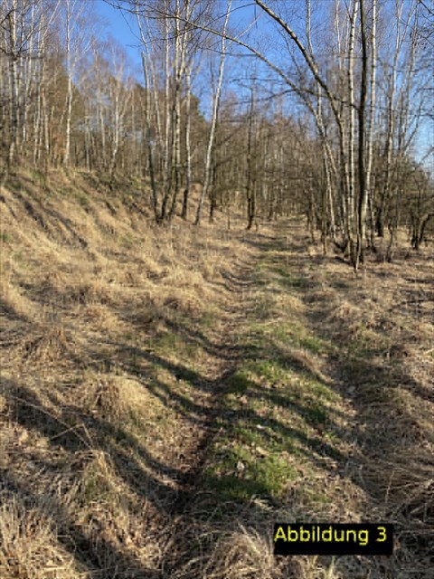 Haltet euch auf dem Weg links. Auf den nächsten Metern können wir auf der linken Seite im Wald viele künstlich aufgeschüttete Wälle (vergl. Abbildung 4) erkennen, die als Schutz der Produktionsanlagen dienten.