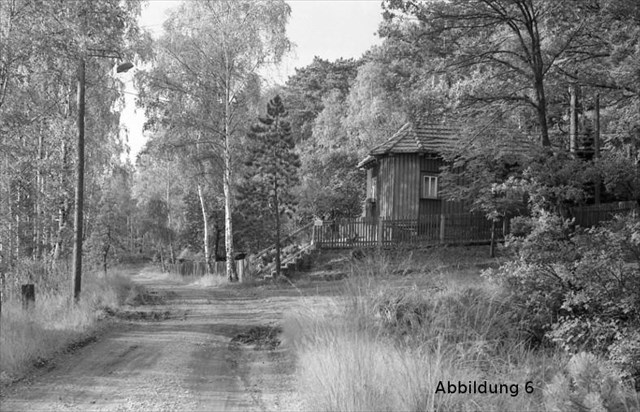 Wenn ihr die Buchstaben ausgezählt habt, laufen wir weiter Richtung Asphaltstraße, die wir schon auf dem Hinweg passiert haben. Rechts auf dem Hang sind wieder die Gebäude zu erkennen, die ihr vom Gleisbett aus schon gesehen hattet. Das Größere war einst die Direktorenvilla, bis der Umzug zum Hüttensteig erfolgte. Wir biegen nach rechts ab und kommen zu unserer letzten Station vor dem Finale - dem Pförtnerhaus der Dynamitfabrik (Abbildung 6).