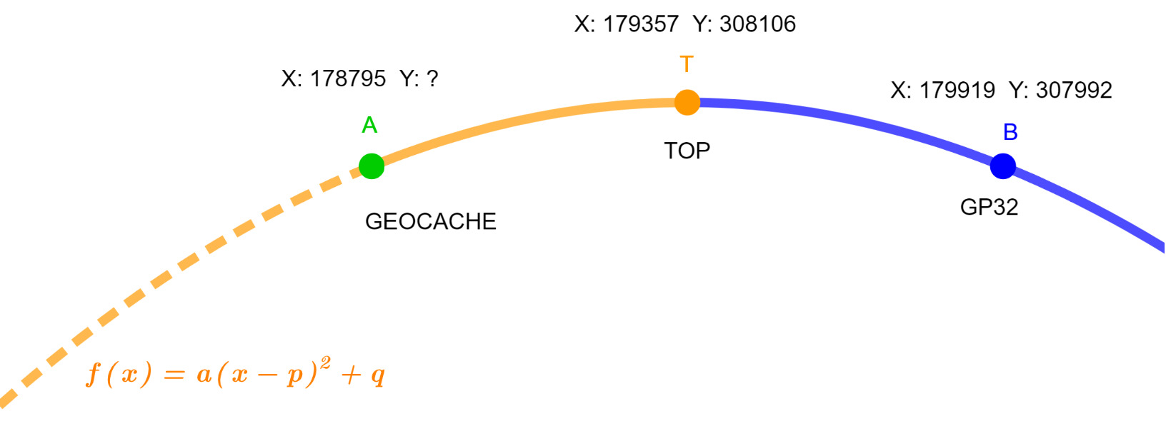 Onderstaand plaatje geeft een schets van het wiskundigeprobleem weer, wederom rond grenspalen. Hierin zijn de coördinaten weergegeven van een parabool, de punten A, B en de top T. Op punt A bevindt zich de uiteindelijke eindstash.