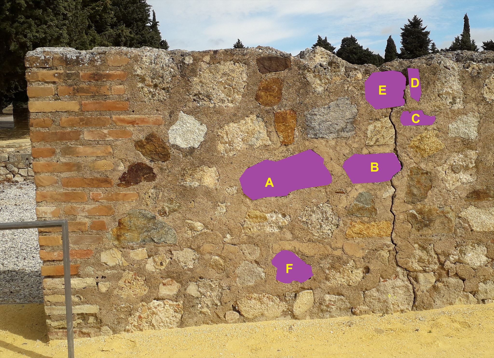 Observe las diferentes piedras que componen la pared, en las zonas A a F de la foto.