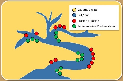 Auf den Wasserlauf des Priels projiziert zeigt sich folgendes Bild. Die Aussenseite und die Innenseite des gezeigten Flussabschnitts des Priels haben unterschiedliche Ufer. Dabei wechseln sich diese Ufer in jeder Kurve von Prall- und Gleithang ab. Der Prallhang charakterisiert sich oft durch ein Steilufer, welches immer leicht unterspült wird. Der Gleithang charakterisiert sich als flaches Ufer. Durch den Einfluss der Gezeiten geht der Prozess der Mäandrierung hier immer wieder von Neuem los.