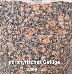 Seltener besitzen auch Plutonite ein porphyrisches Gefüge. In diesem Fall kristallisieren einige Mineralphasen des Magmas durch Änderung der Temperatur oder des Druckes rascher aus als die anderen zuvor. Es entsteht dann eine fein- bis mittelkörnige Grundmasse mit bis zu mehreren Zentimetern großen Einzelkristallen.