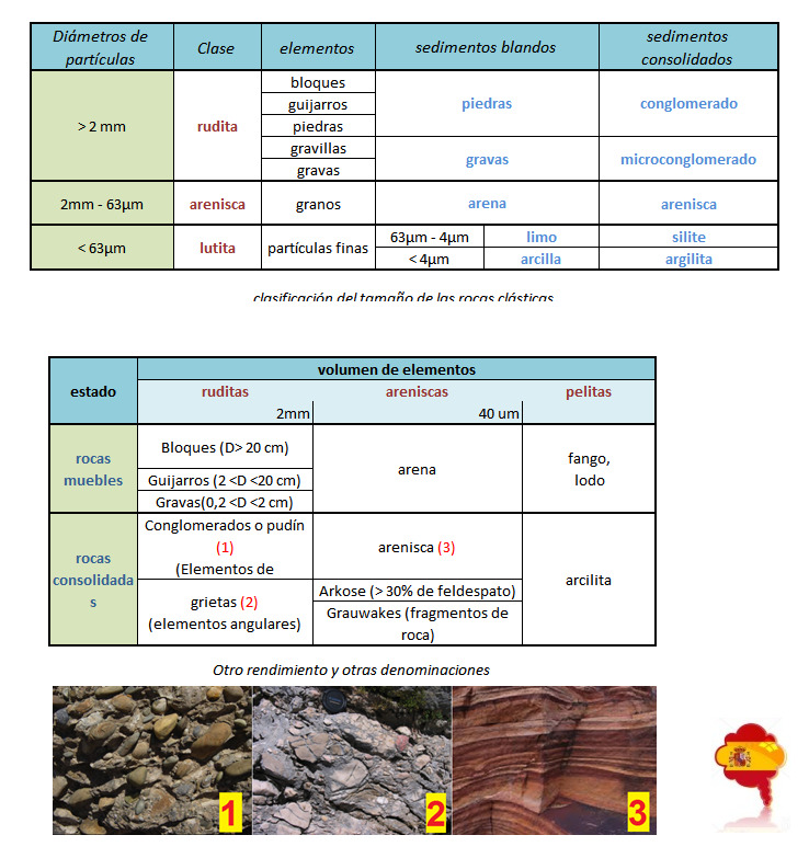 - A size classification: based on the size of the elements (or clastes) and whether or not they are consolidated according to the following table