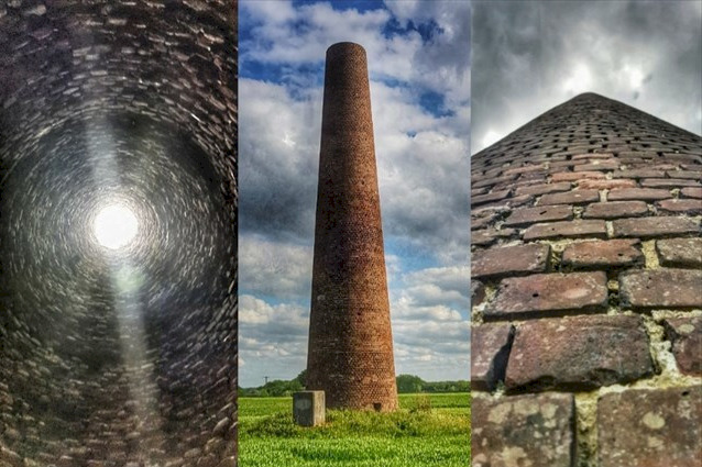 La rencontre de cette imposante cheminée de 14 mètres de haut a de quoi étonner. En effet, aucune trace de vestige industriel à proximité ne vient justifier sa présence. Renseignements pris, nous apprenons que nous sommes en présence d’une cheminée géodésique.