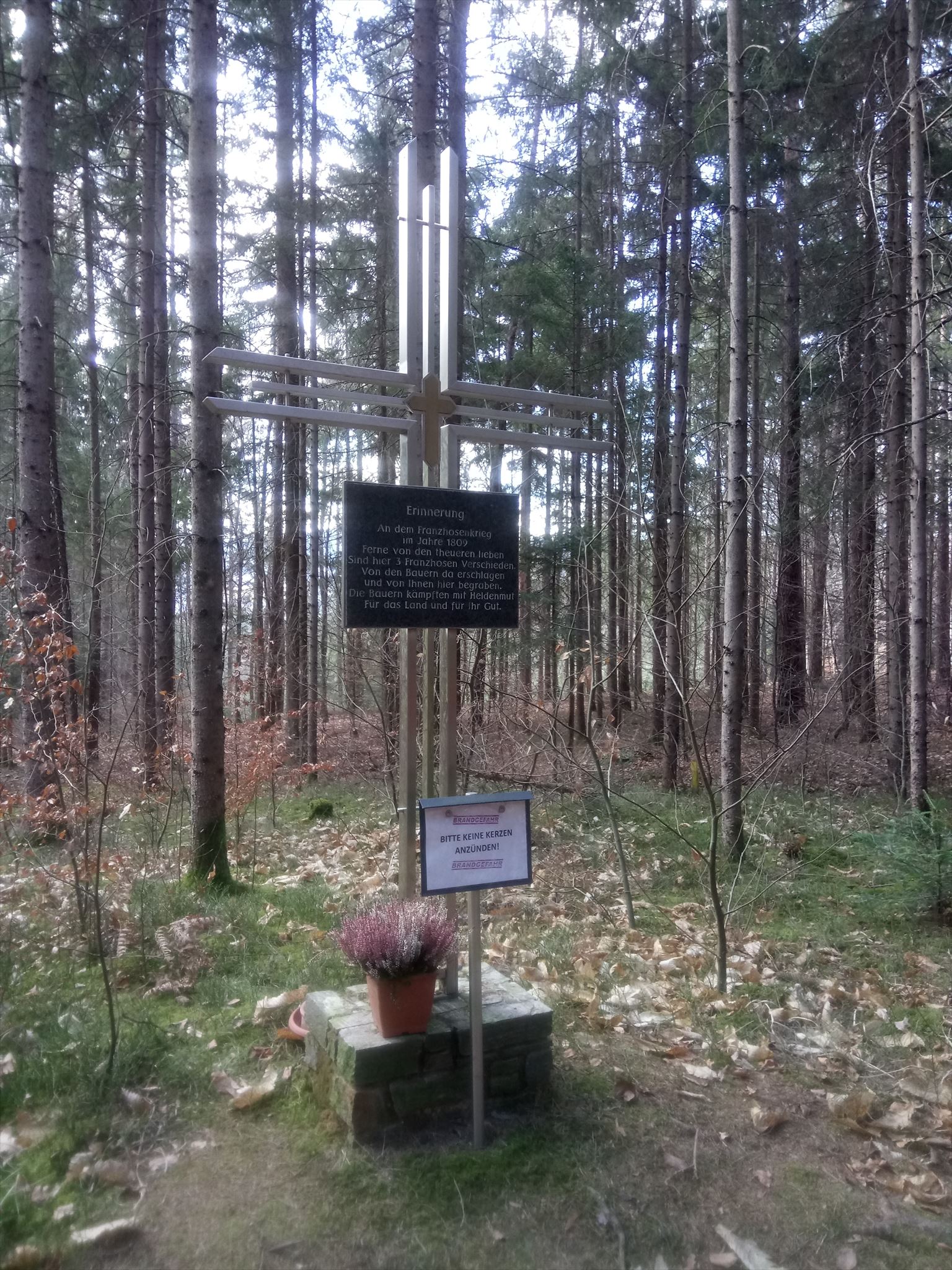 Der Weg zum Ausgangspunkt führt über Feld- später Gemeindewege zur Bundesstraße 76. Dort Kriegerdenkmal und Kreuz. Wir gehen links und können bei der Ampel die Straße gefahrlos queren.