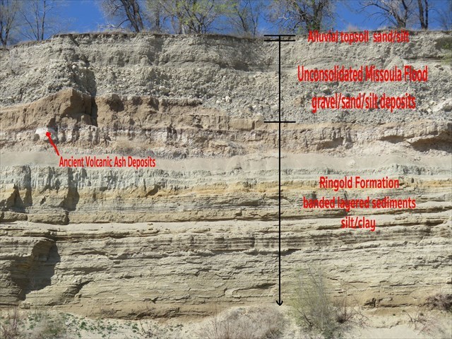 Describe the thickness and structure of A) the top soil, B) the Missoula Flood debris and C) the Ringold Formation sediment layers.