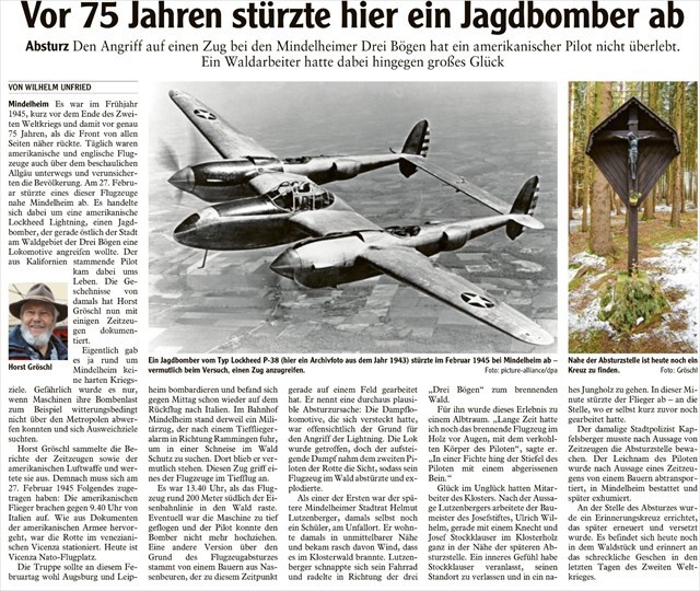 Am 27.2.1945 kam es hier zu einem tragischen Flugzeugabsturz. Ein amerikanischer Jagdbomber vom Typ Lockheed P-38 stürzte in diesem Waldgebiet ab und der Pilot kam dabei ums Leben. Zur Erinnerung an den Absturz wurde in der Nähe der Absturzstelle ein Kreuz aufgestellt, das immer noch jemand mit frischen Blumen schmückt und ab und zu ein Lichtlein brennen lässt.