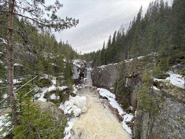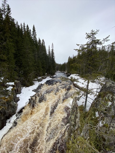 Från parkeringen finns det en stig som tar dig först ner och sedan ut via en hängbro mot Helvetesfallet. För bästa möjliga utsikt se waypoint. Därifrån har du en dånande utsikt över de vattenmassor som passerar under dina fötterna! Det finns skyddsräcken men mindre barn bör hållas under uppsikt. Ladda gärna upp en bild med dig från utsiktsplatsen.