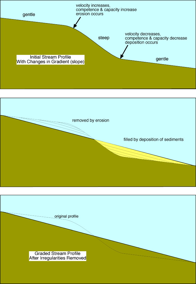 Scour or riverbed erosion -- Where a stream flows down a steep slope, velocity will increase resulting in increased erosion of the riverbed (a process called scour) as the flow accumulates silt, debris, and any chemicals or pollutants contained in it. Where that stream then flows onto a gentler slope velocity decreases and suspended material that was carried along by the water will settle out as sediment in a process called deposition. As a result, the steeper slope is eroded away over time and the more gradual slope is filled in, making for a more uniform slope.