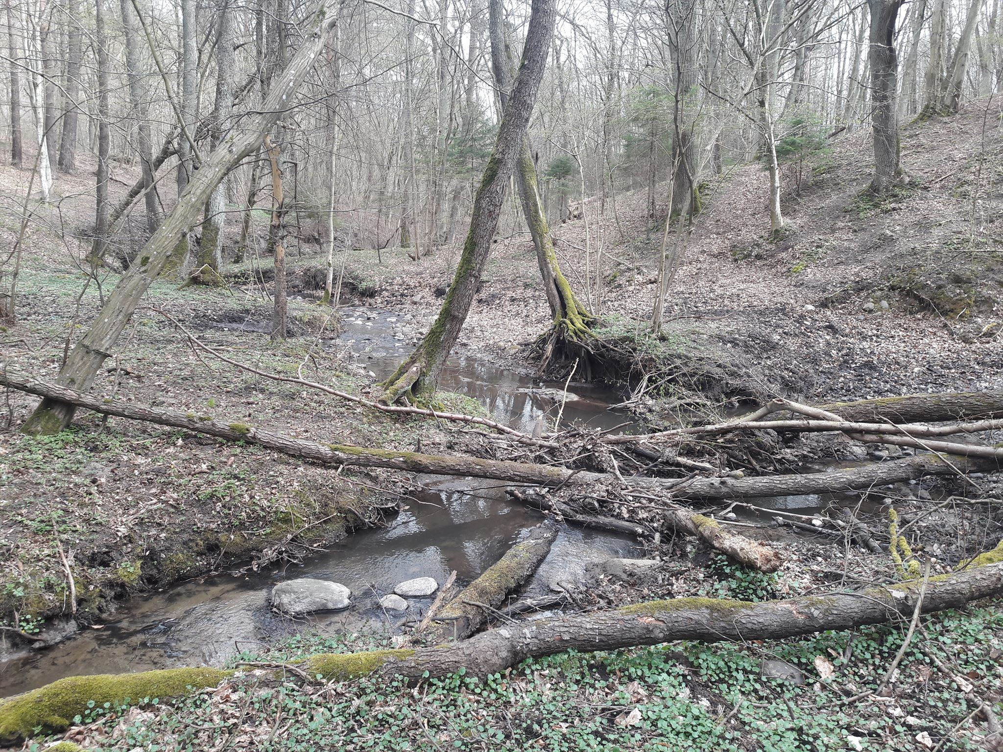 Pięknie meandrujący odcinek potoku. Nic dziwnego, że "coś" nie wyrobiło na zakręcie! Wyniosło i utknęło... Niech Cię nie wciągnie... ;)