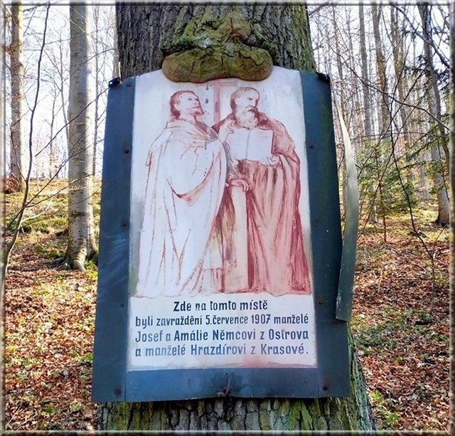 U silnice z Křtin do Jedovnic za kamenolomem před arboretem se v době první republiky a ještě několik roků po druhé světové válce nalézal na stromě u silnice plechový obraz věrozvěstů sv. Cyrila a Metoděje s tímto textem: "Zde na tomto místě byli zavražděni 5. července 1907 manželé Josef a Amálie Němcovi z Ostrova a manželé Hrazdírovi z Krasové." V roce 1946 byl obraz renovován. V rámci rozšiřování silnice v sedmdesátých letech byl starý strom odstraněn a obraz přesunut na druhou stranu silnice, na statný dub, stojící v lese asi deset metrů od silnice. Za čtyřnásobnou vraždu jmenovaných manželských párů byli obviněni a souzeni manželé Marie a Jan Vajckornovi a jejich syn Jan z Ostrova u Macochy. Hromadná vražda se stala v noci, mezi první a druhou hodinou ranní a objevena byla k ránu hajným Ambrosem, jenž nález nahlásil křtinským četníkům. Zločin byl proveden ukrutným způsobem: vrahové sledovali povoz, počkali si na něj ve křoví a pak podnikli útok; oběti byly usmrceny ve spánku nesprávně se uvádí , že v boji nalezen byl převrácený povoz, vedle něho a něho a pod ním jednotlivé mrtvoly s uřezanýma ušima. Vražda byla provedena sekerami a to vše k vůli 700 K. Vrahové byli záhy vypátráni a tentýž den zajištěni. Odhaleny byly vražedné nástroje a zakrvácené oděvy v bydlišti Vajckornů. Po třídenním soudním zasedání a jednání byli všichni tři odsouzeni k trestu smrti. Obvinění podali k rozsudkům zmateční stížnost a žádost o milost k Jeho Císařskému Veličenstvu s tím, aby vražedníkům byl udělen přiměřený trest na svobodě. Trest smrti byl všem třem odsouzeným změněn císařskou milostí na doživotní tuhý žalář s každoročním půstem v den 6. července.