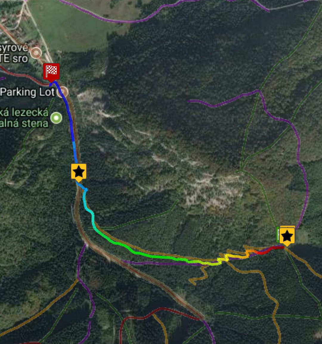 - A: Od konca Višňového po lesnej ceste dolinou až po bod A1, kde budete ďalej pokračovať po lesnom chodníčku na ľavej strane. Ten vás dovedie až do sedla a ku keške.