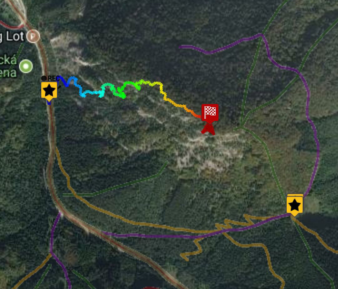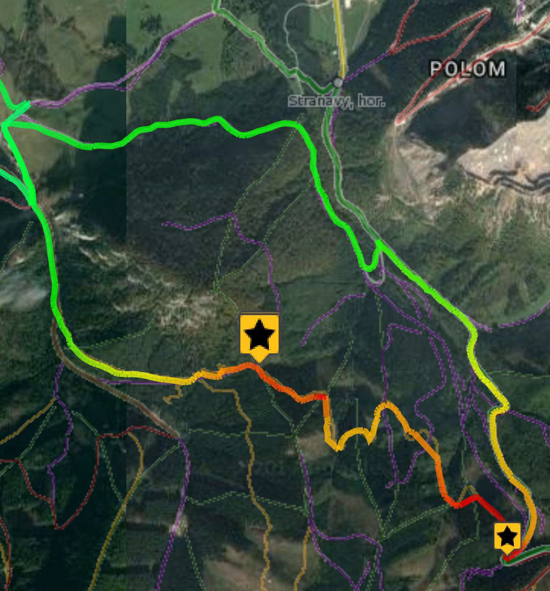 - C: Bicyklom od konca Stráňav, cez Stráňavskú dolinu až po odbočku C1. Tu z cesty odbočíte na singletrack, ktorý začína na pravej strane cesty. Ten vás dovedie až do sedla k pomníčku. Od kešky sa môžete pustit singlíkom podľa trasy A do Višňového.